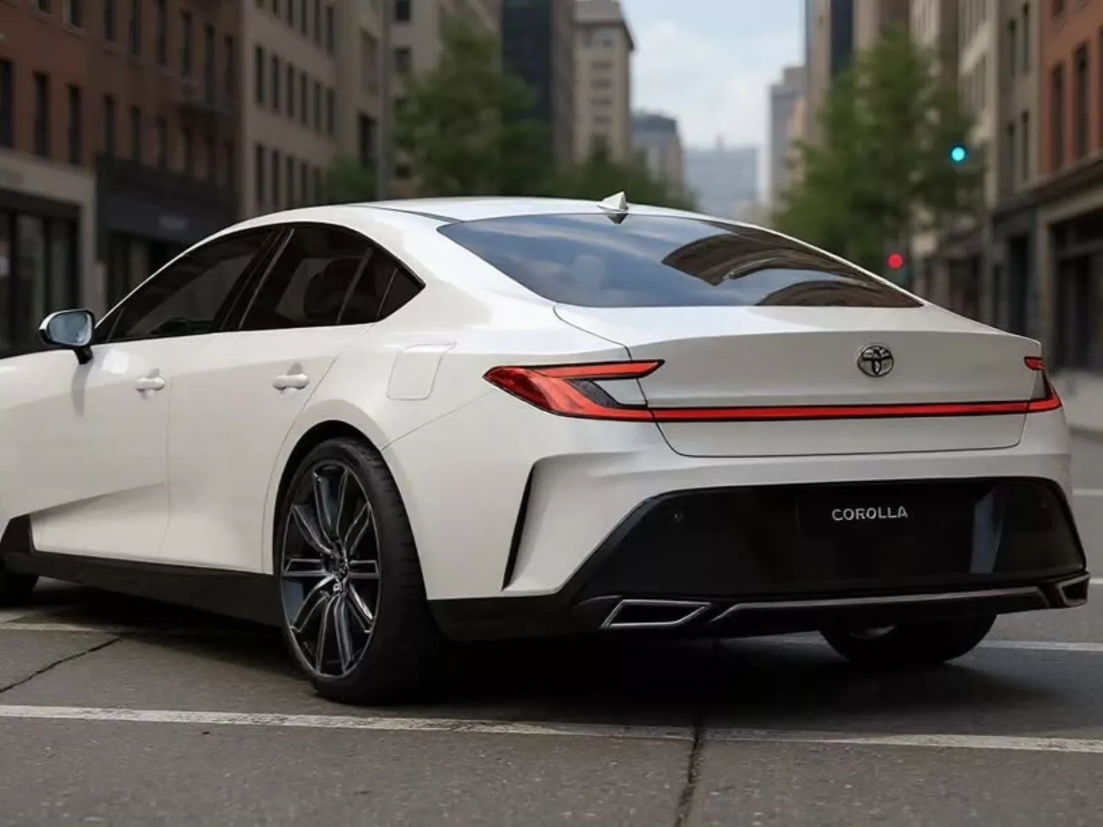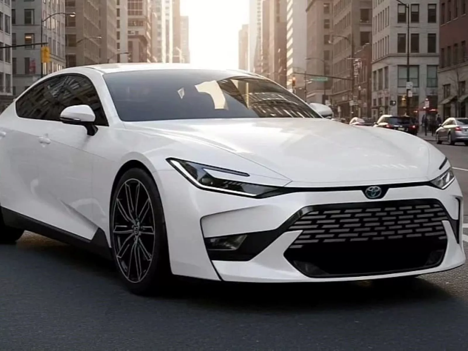 O conceito imaginado para 2027 aposta em um design muito mais agressivo e moderno. A dianteira lembra bastante a do Camry, com faróis afilados, para-choque cheio de recortes e uma grade ampla e imponente.